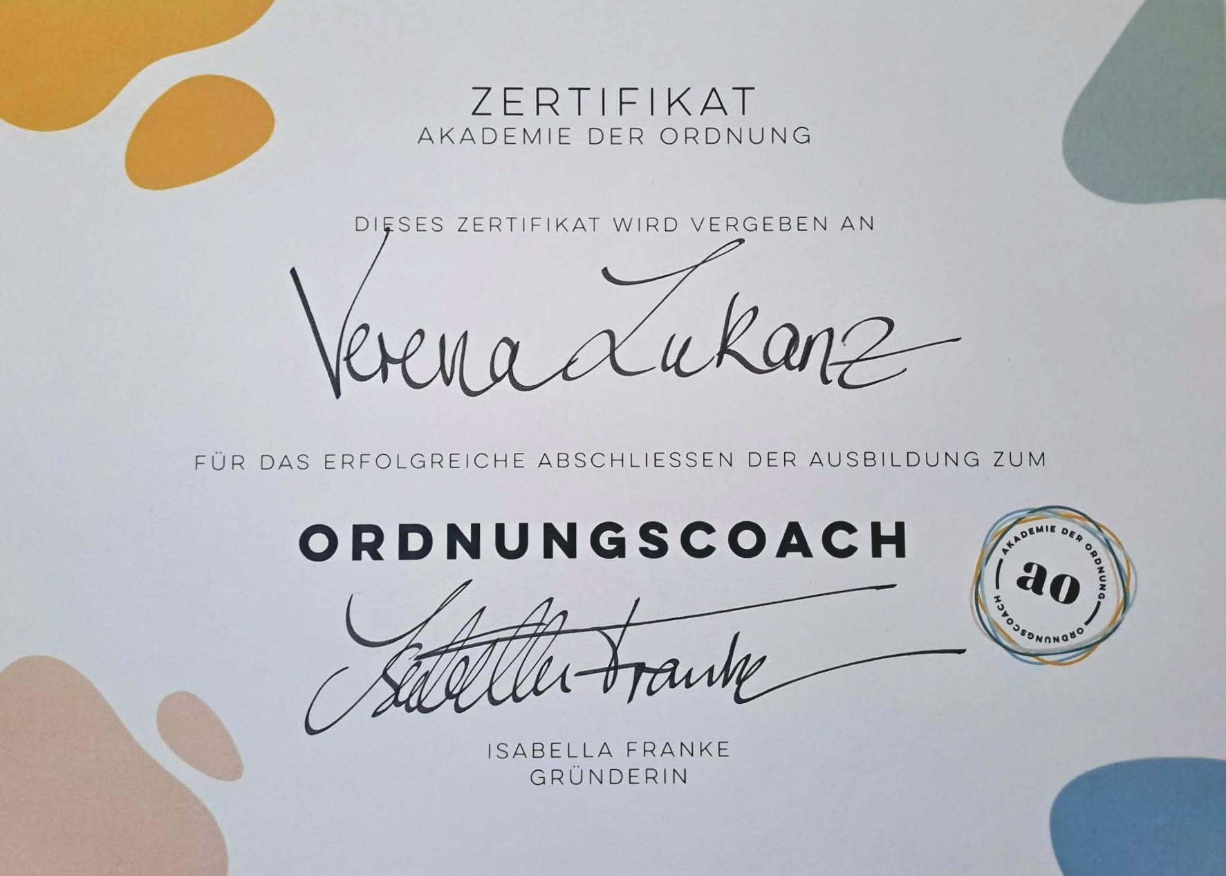 Meine Ausbildung zum zertifizierten Ordnungscoach habe ich an der Akademie der Ordnung bei Isabella Franke absolviert. Dabei wurde mir klar, dass meine bunte Persönlichkeit perfekt zu dem Beruf als Ordnungscoach passt und dann kam die Ordnungsoase.